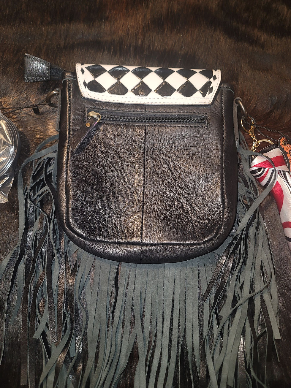 Black and White Checkered Leather Fringe Crossbody Bag